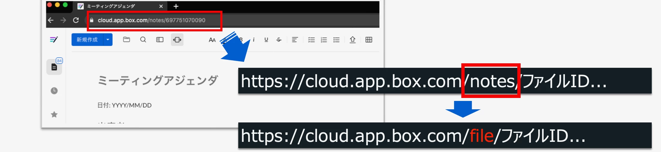 Box NotesのURLのうち「notes」を「file」に変えると読み取り専用のBox Notesとなります。
