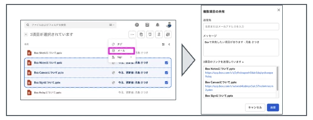 共有リンクを作成したいコンテンツを選択した状態で、画面右上の「メール」ボタンをクリックすると「複数項目の共有」というダイアログが開きます。下の方にある「X項目のリンクを送信しています」を展開すると、選択したコンテンツの共有リンクが全て作成されています!