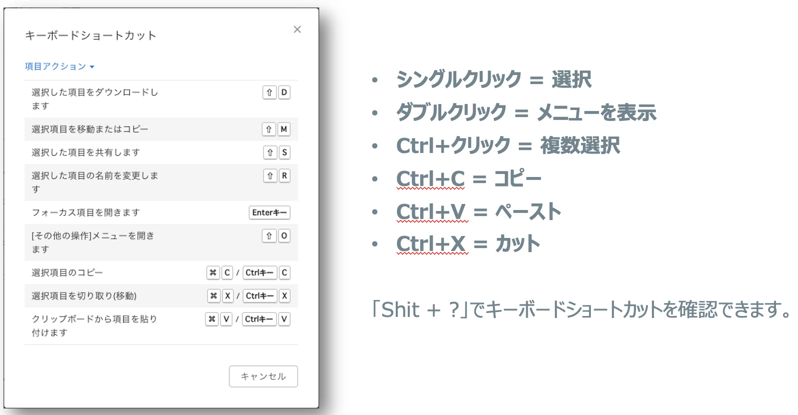 Boxをウェブアプリケーションで利用している時はキーボードショートカットを利用することができます。マウスの右クリックや複数アイテムの選択、代表的なキーボードのショートカットに対応しており、「Shift+?」キーを押すとキーボードショートカットの一覧が表示されます。