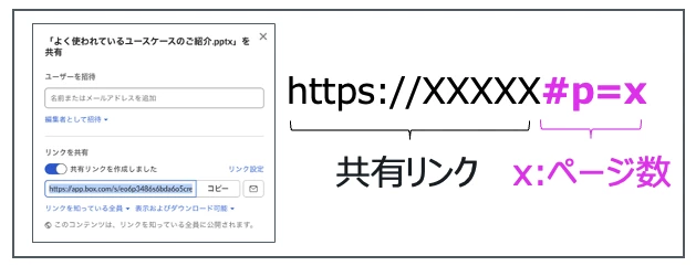 - スライドや文書ファイルの場合:「#p=X」(X:ページ数)を追加すると、URLを開いた時に指定ページが直接開きます。