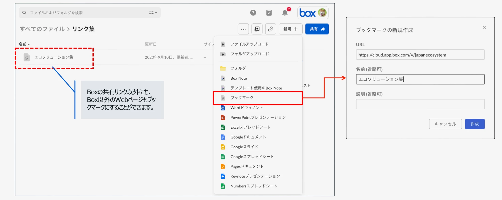 WebページのURLをBox上に保存するブックマーク機能を使うと、異なるフォルダ内にあるコンテンツへのクイックリンクを好きなフォルダに作成することができます。