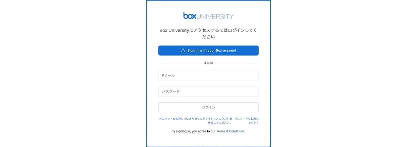 メールアドレスおよびパスワード を登録して、ログイン(Box のアカウントをお持ちでない方はこちらの方法をご利用ください)