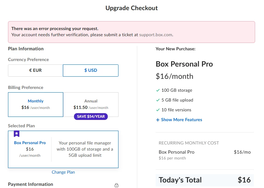 We need to take a closer look at your upgrade request and investigate what’s causing the verification error. Please email our Billing Team at billing@box.com for assistance, and be sure to use the email associated with the Box account you’re trying to upgrade so we can authenticate your request.