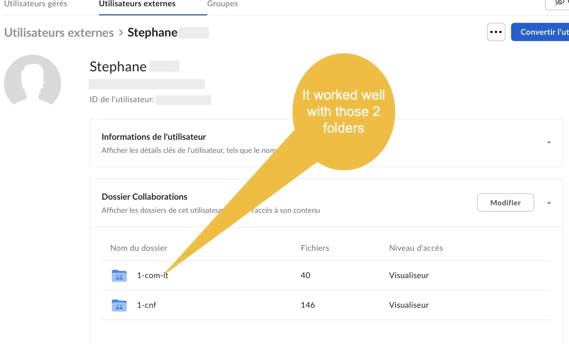 I created an API request with cUrl to give access to a folder to an external user. I used the collaboration request and it worked for a very few folders and doesn’t work with most of them.
