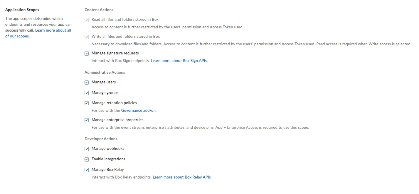 All available scopes for the app have been enabled in the developer console (including read/write for files and folders).