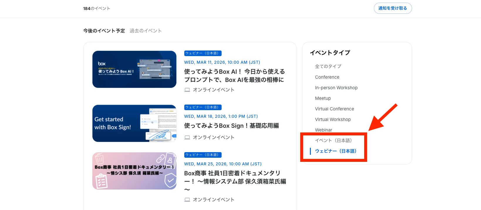 日本語のイベントやウェビナーだけを選んで表示できます