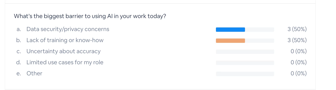 Live polls showcased important barriers to AI adoption, including data security, workforce skills gaps, and personal comfort levels with organizations using AI.