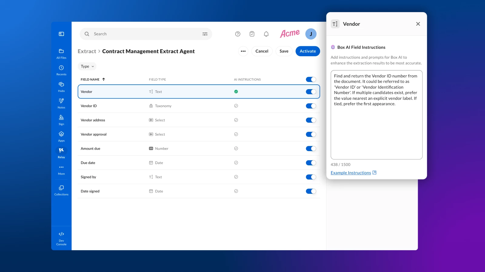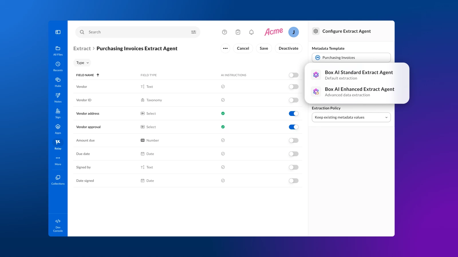 These Custom Extract Agents can be deployed to specific folders in Box to automatically extract structured data from content at scale.