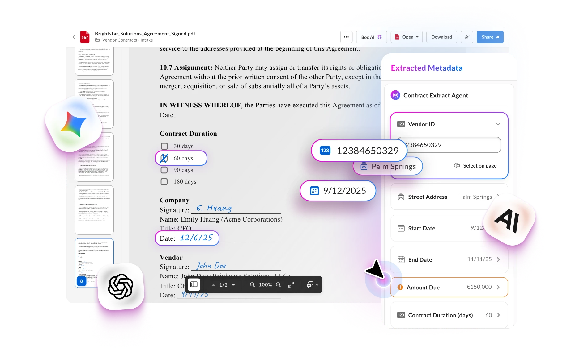 The majority of enterprise data is unstructured, and until recently, attempts to harness actionable insights relied on manual processes or custom automation tools that were expensive to maintain and impractical to scale. Box Extract addresses these challenges by combining the latest AI models, advanced OCR capabilities, and agentic approaches that understand document structure and meaning to automatically and accurately extract information from a variety of content. It enables business process owners to configure, customize, and manage their data extraction processes via a dedicated user interface and save them as Custom Extract Agents, which can be applied to specific folders in Box to automatically extract structured data from content at scale. We do this with a combination of: