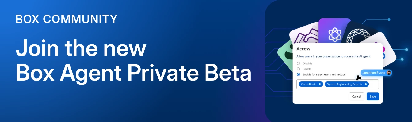 Thanks for championing innovation by rallying the community around the new Box Agent Private Beta. This opened the door for members to explore goal‑driven AI capabilities that work securely with their enterprise content.