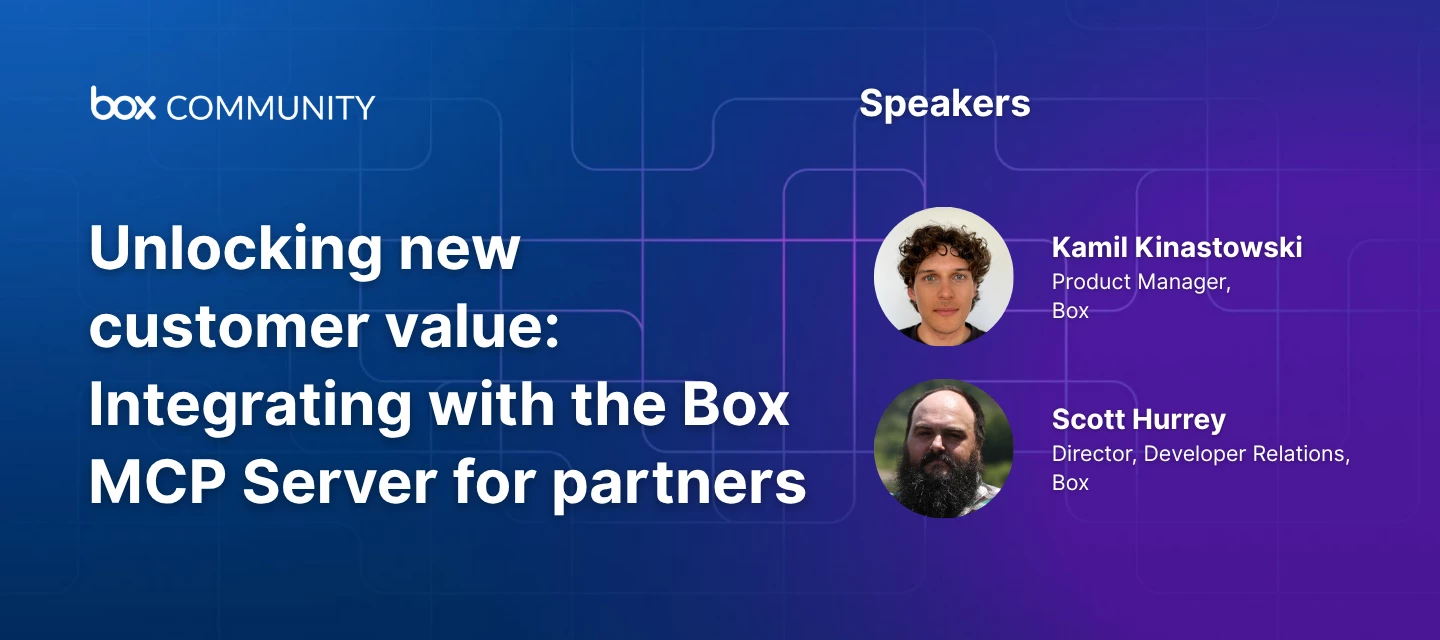 📣 Join us Thursday, Oct 23 at 1PM PT for a community roundtable on unlocking new customer value with the Box MCP Server — the secure content layer for AI. Learn how to accelerate your roadmap, reduce engineering overhead, and connect your AI agents to the content that matters.