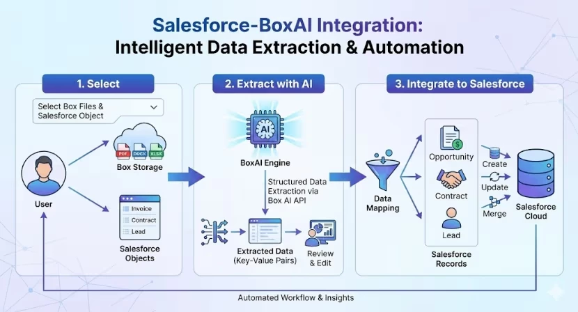 Box AI Data Extraction for Salesforce integration leverages Box AI’s intelligence to automatically extract structured data from documents stored in Box and seamlessly create or update Salesforce records.