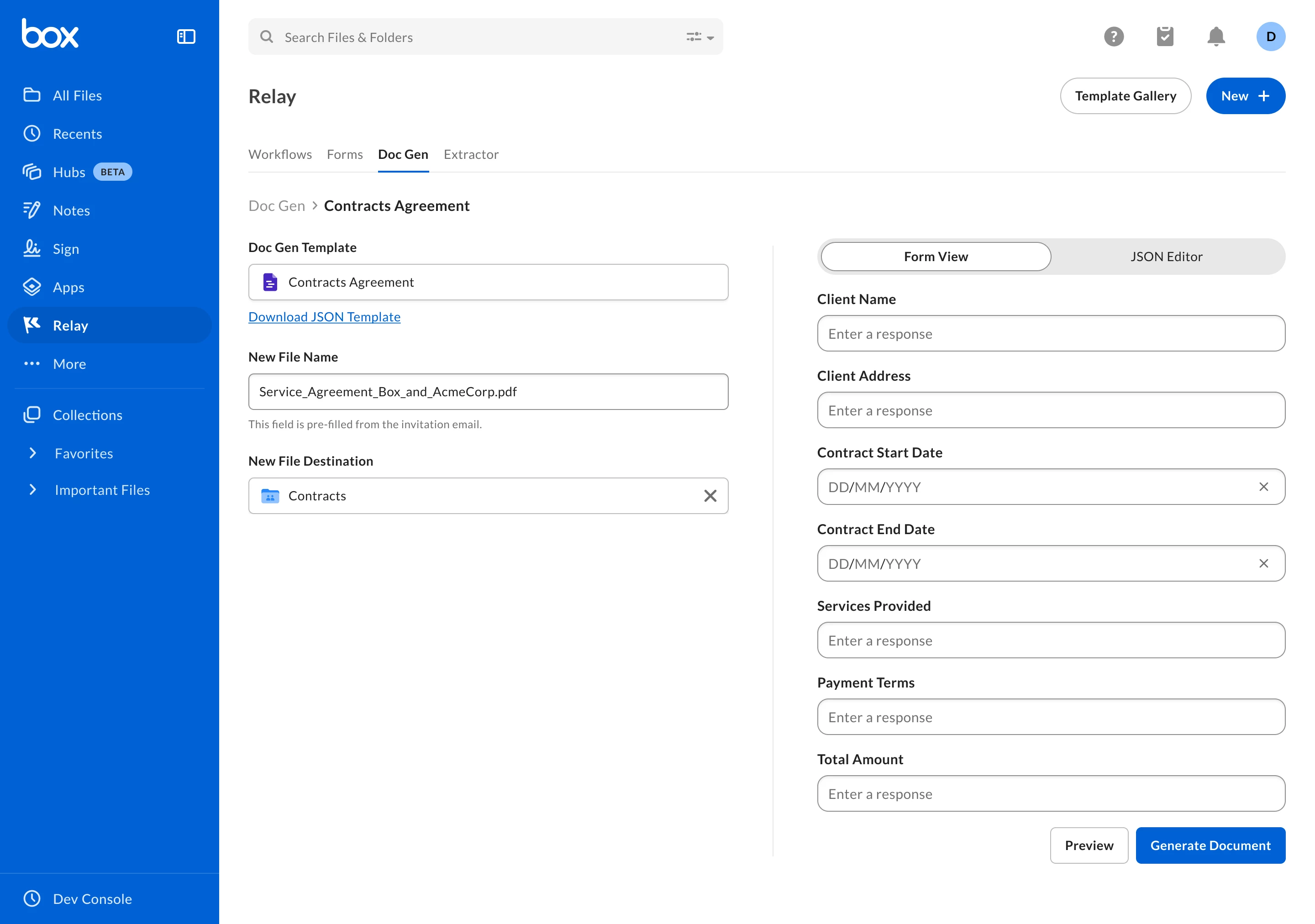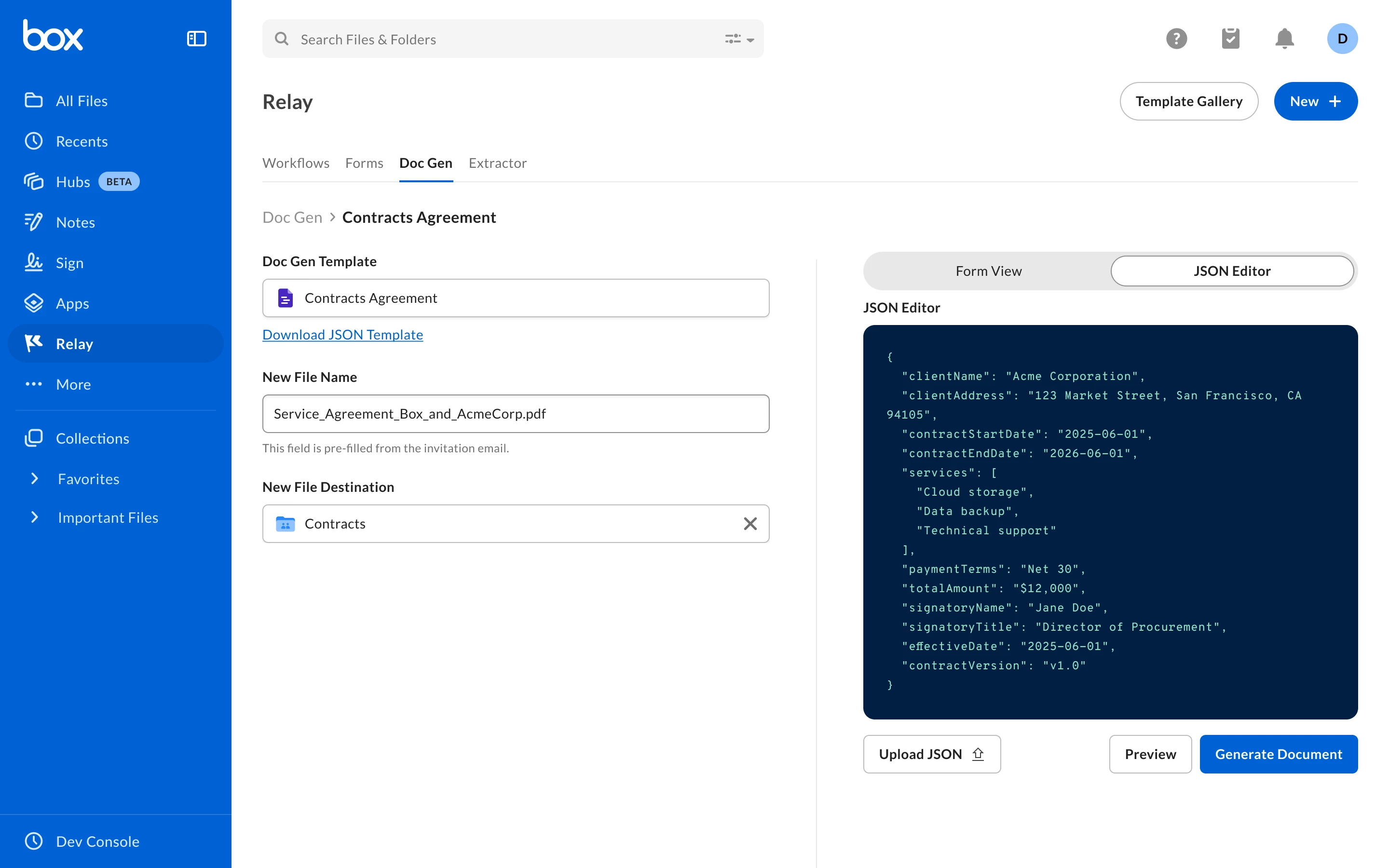 - Use the template in tandem with JSON data to dynamically generate and preview documents directly within Box Doc Gen
