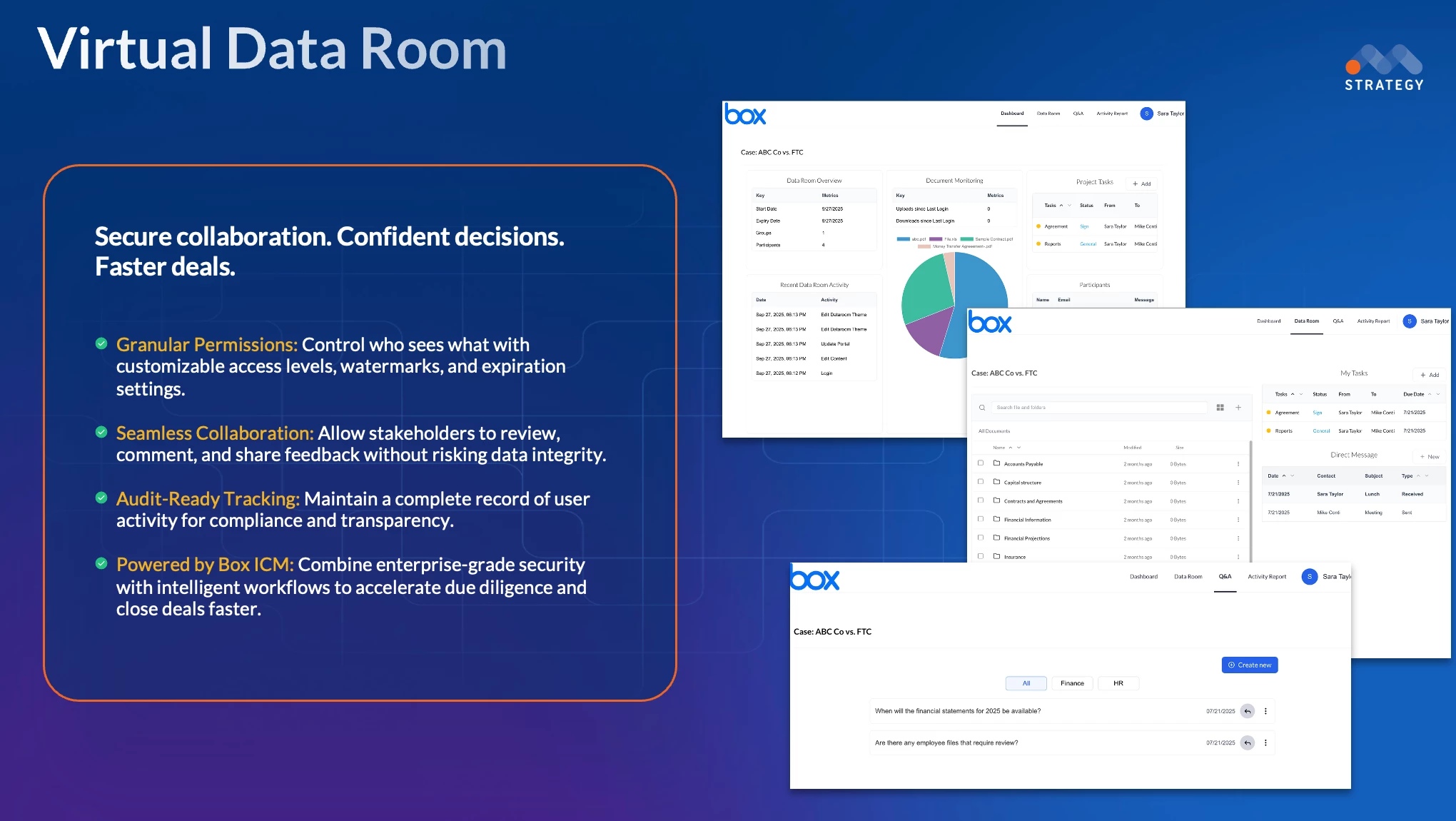 Virtual Data Room (VDR): Secure environments for M&A, legal workflows, and life sciences applications, featuring granular permissions, activity tracking, encrypted m