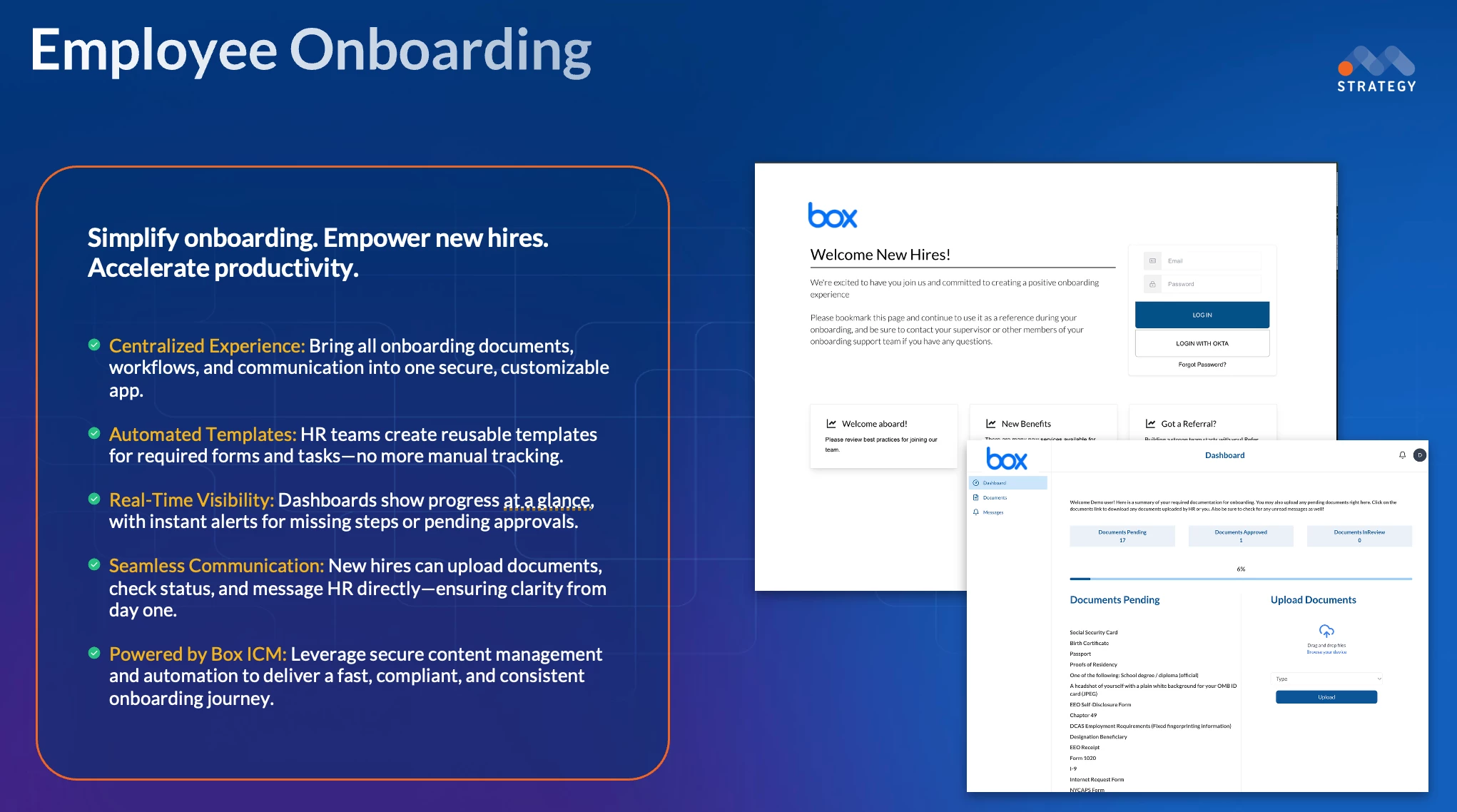 HR Onboarding & Compliance: The demo featured onboarding use cases where admin oversight ensures document submission accuracy. With features like activity tracking and secure notifications, mStrategy solutions ensure compliance without procedural bottlenecks.