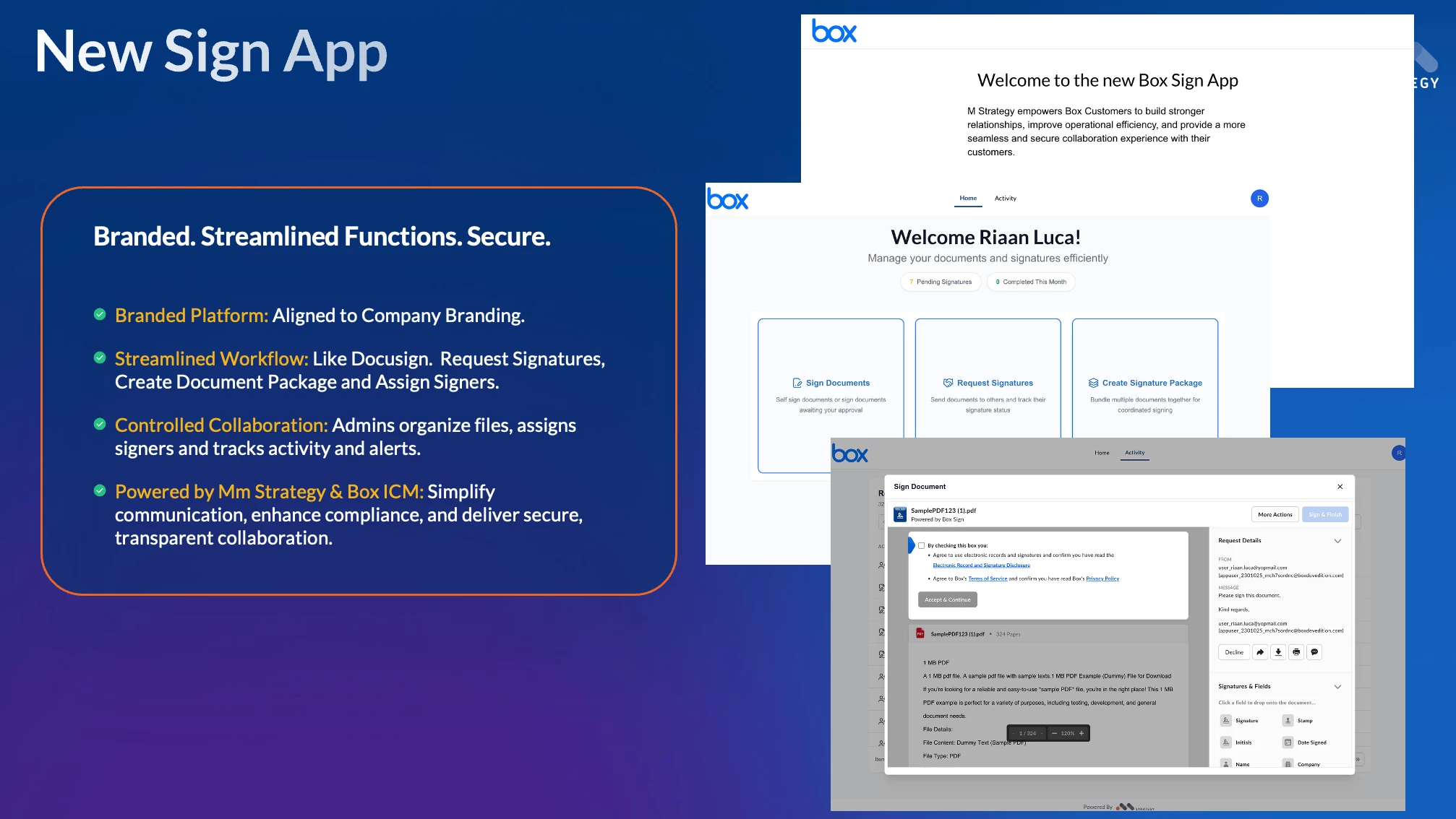 Standalone Box Sign Enhancement: A branded e-signature tool built to provide capabilities akin to DocuSign, with added flexibility and customization for specific business needs.