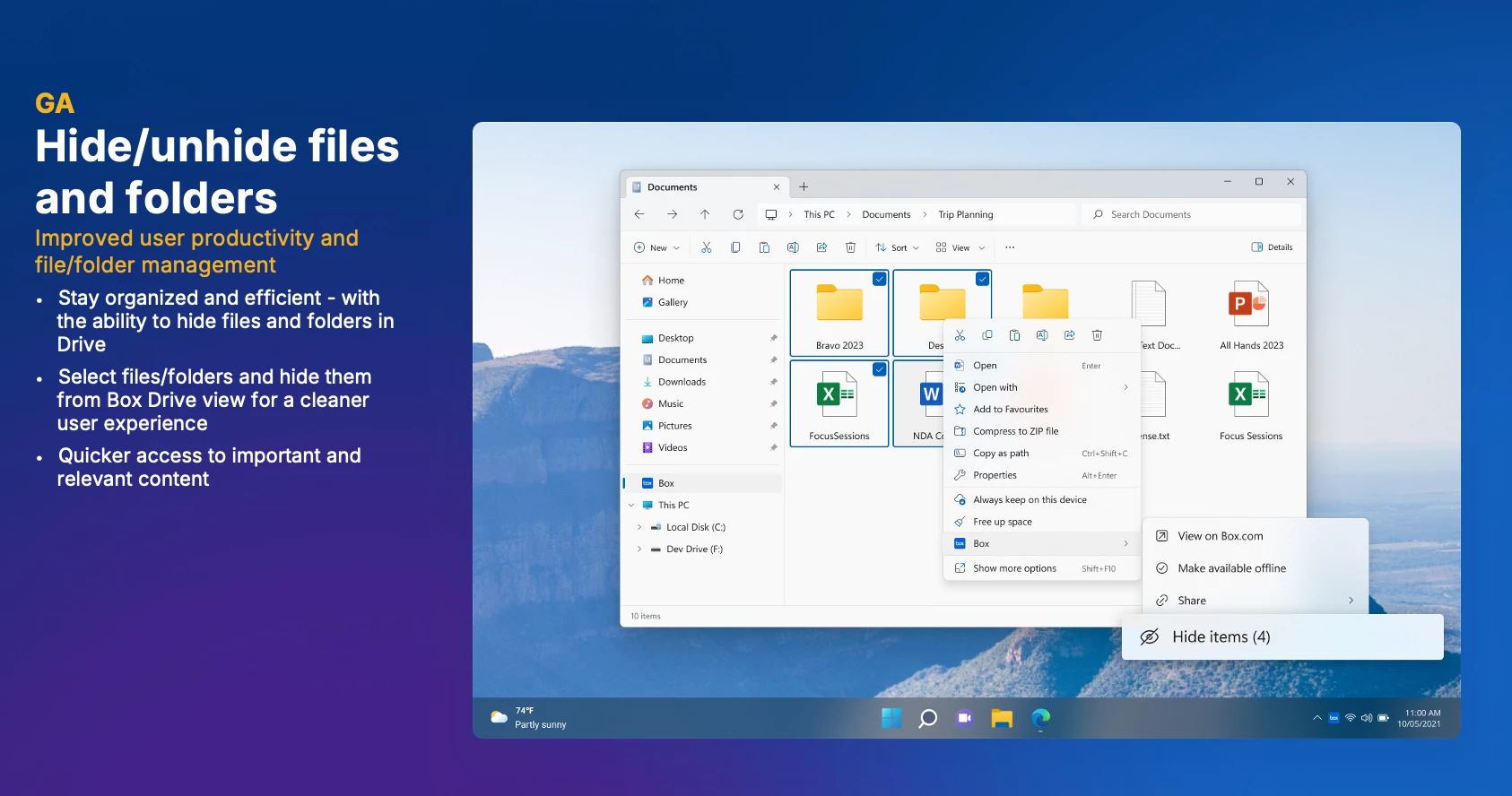 To tackle content sprawl, Box Drive now includes the ability to hide files or folders. Hidden folders remain accessible via Box web or can be unhidden as required. This innovation directly responds to customer requests for better organization tools.
