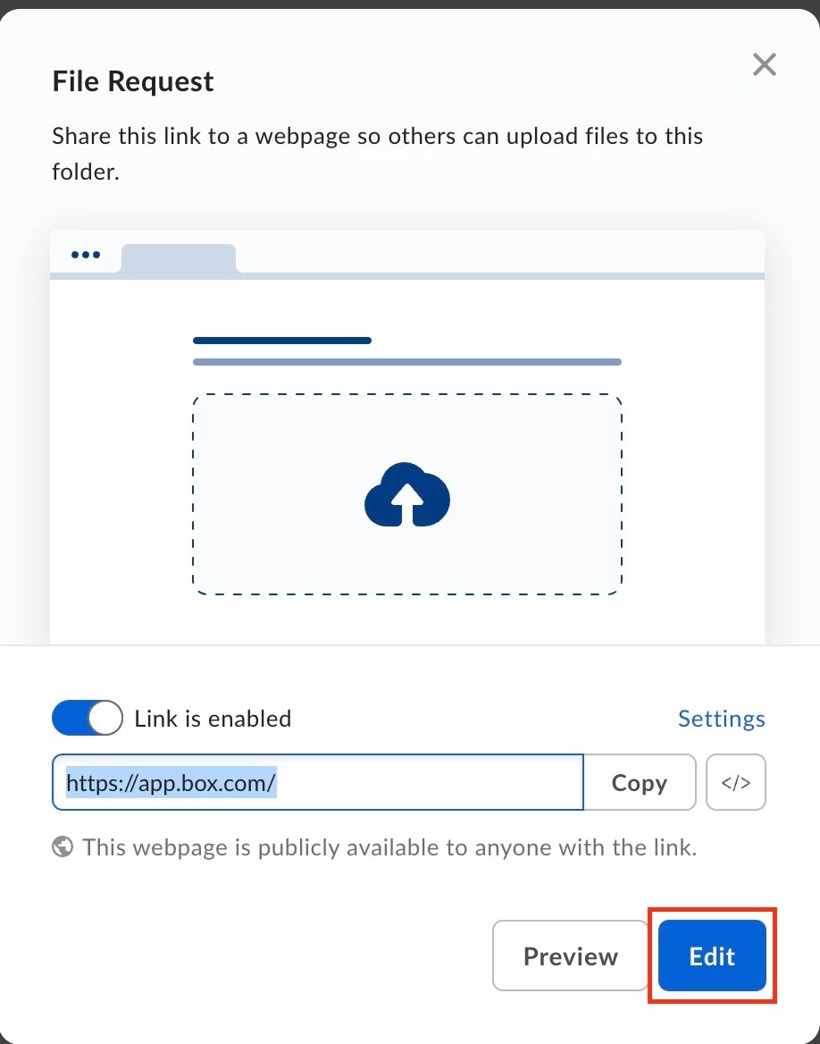 To edit your File Request form and apply the metadata template, go to the folder where the File Request is enabled. In the Sharing pane on the right, under File Request, click File Request enabled. When the File Request window opens, click Edit → Add a Field → File Metadata, then select the metadata template you created → Add metadata fields → Save.