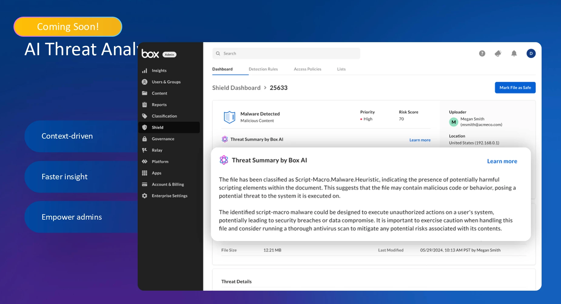 Box will soon introduce AI Threat Analysis, an intelligent feature designed to summarize dense alert data into actionable insights.
