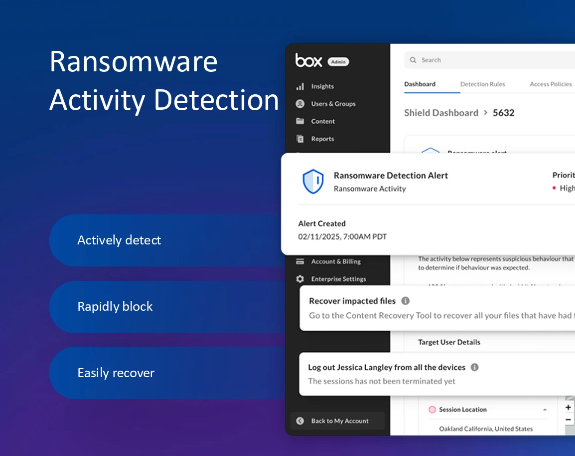 Session Termination: Allows admins to terminate affected user sessions, cutting off ransomware’s access to Box content.