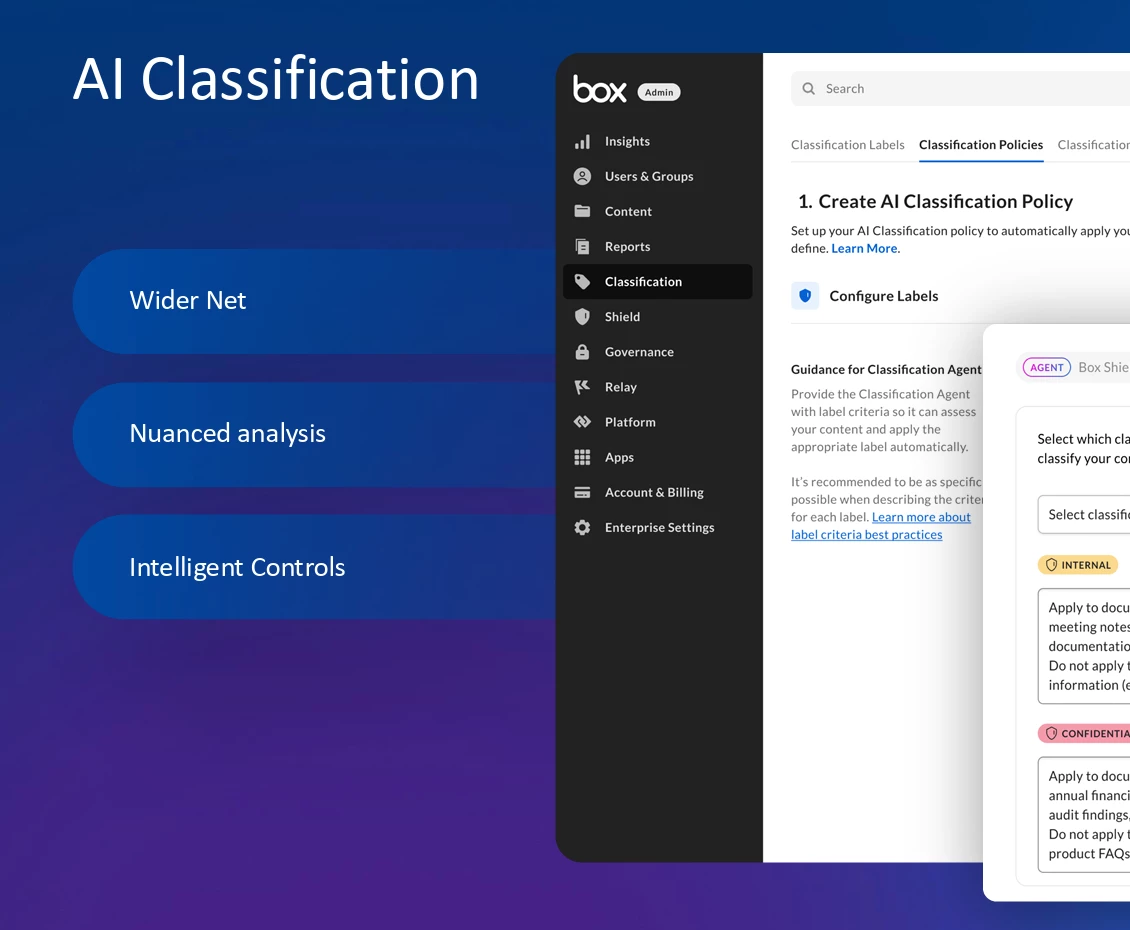 AI Classification Agent: Supports automatic content classification based on organizational policies.