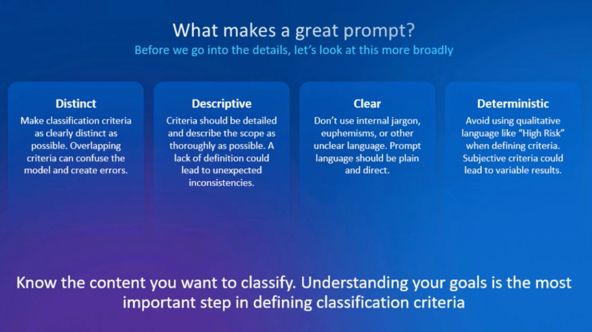 Creating effective prompts is not a one-size-fits-all approach; it requires alignment with organizational policies, security goals, and classification labels. Here are the key steps outlined:
