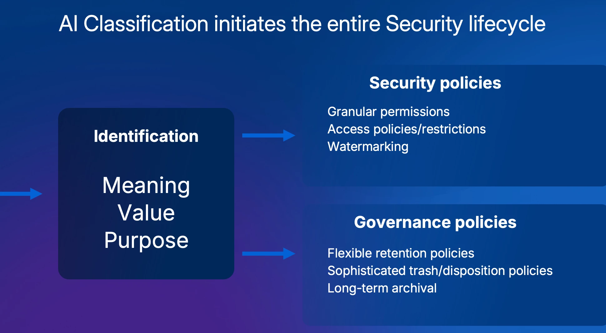 “And the reason we'd want to do this {implement AI classification} , is because once you get that classification level , if you get it correct in Box that carries all of these policies alongside it , that carries granular permissions , access controls , watermarking , a variety of governance retention and disposition policies . Looking forward , we're building an archival like it carries the entire content security lifecycle started by these policies” added Ben