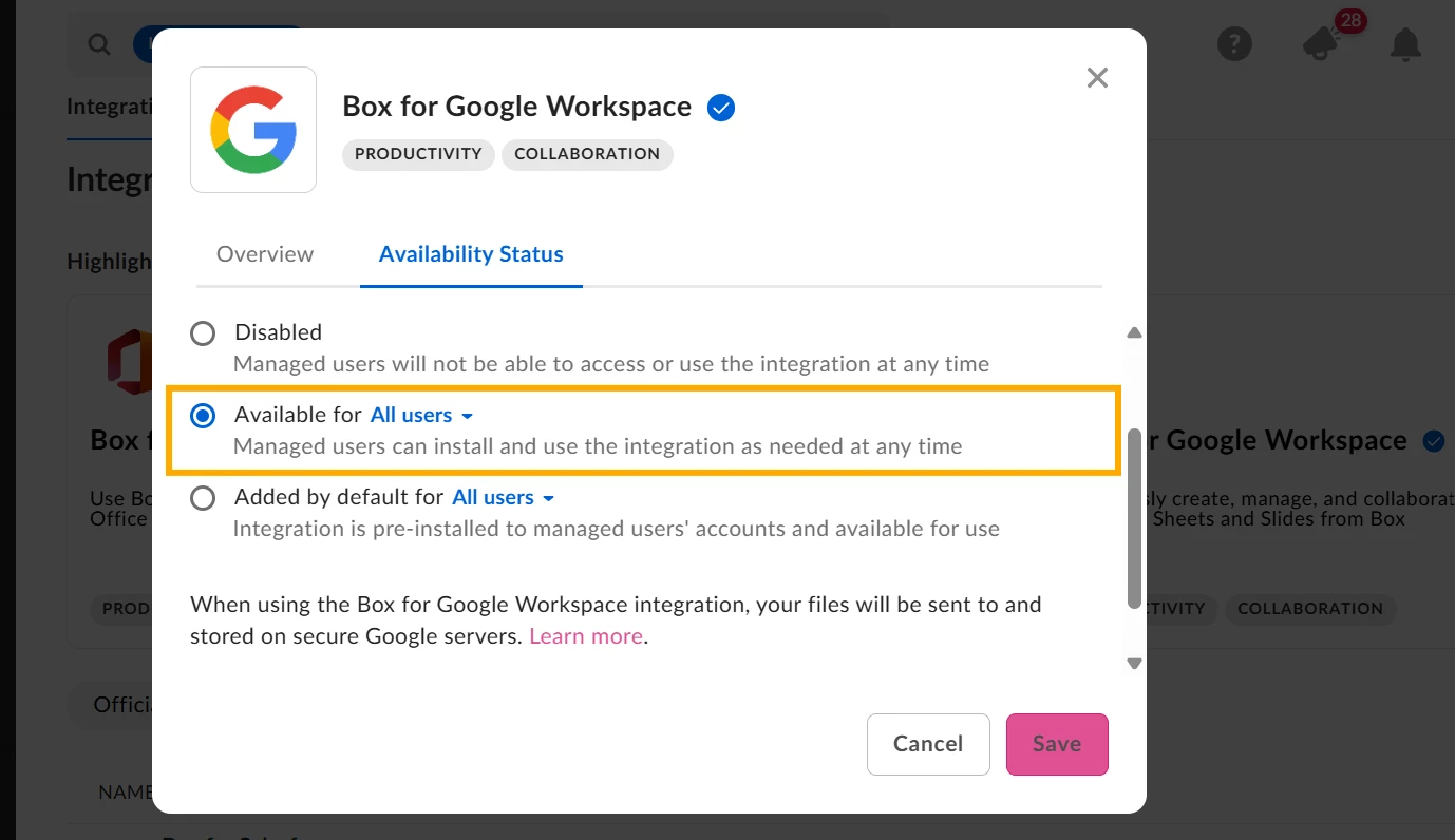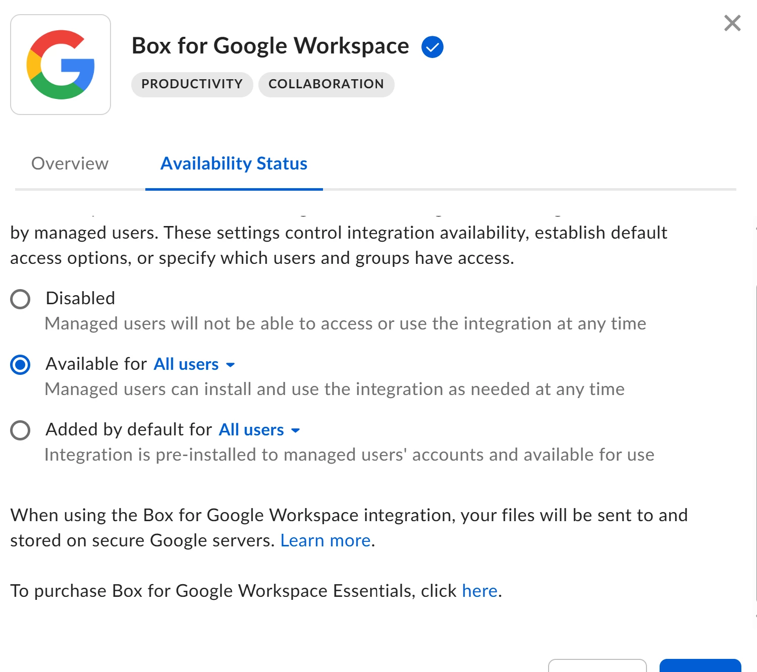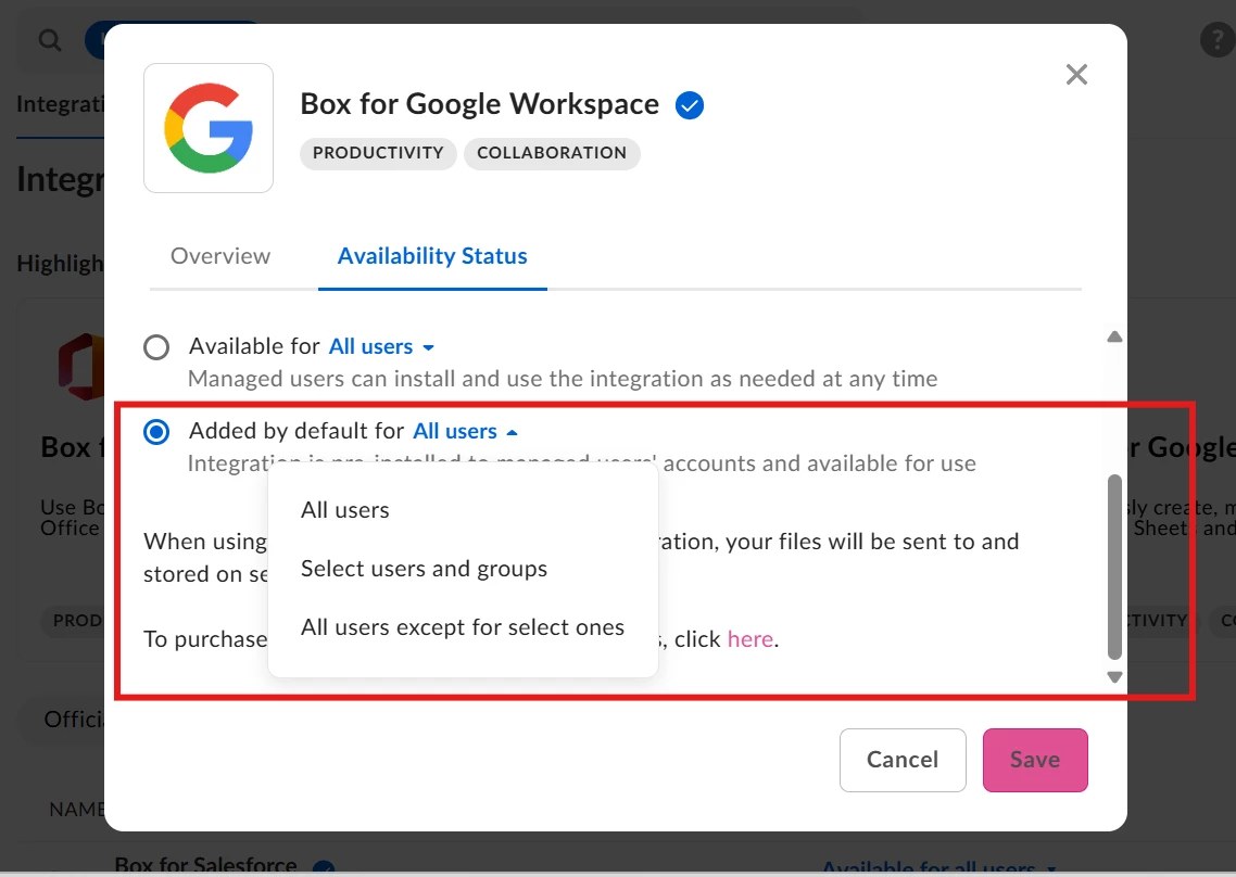 - Look for Box for Google Workspace and select Available for all users to make it available across all users in your enterprise. However, if you plan to enable it for select users you can choose Added by default -- All users, Select users and groups or All users except for select ones.