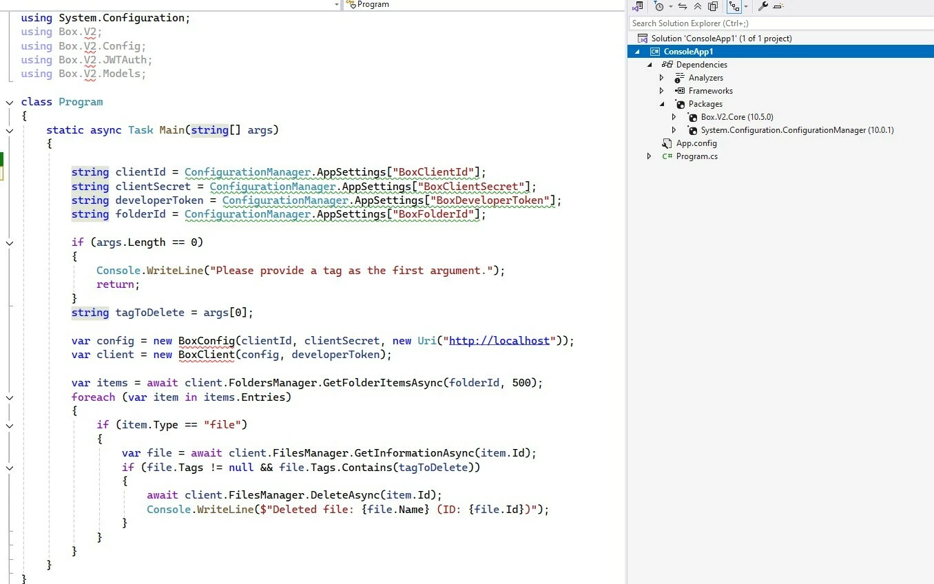 We are utilizing Visual Studio 2022 to create this console application. Although we can reference Box.V2.Core through NuGet, the namespace is not recognizing the packages.