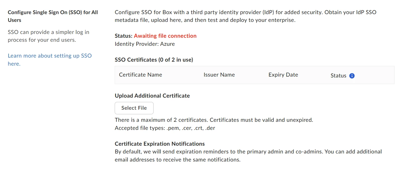 I am currently configuring SAML SSO for Box using Azure AD as the Identity Provider, but the setup seems to be stuck and I’m unable to proceed.