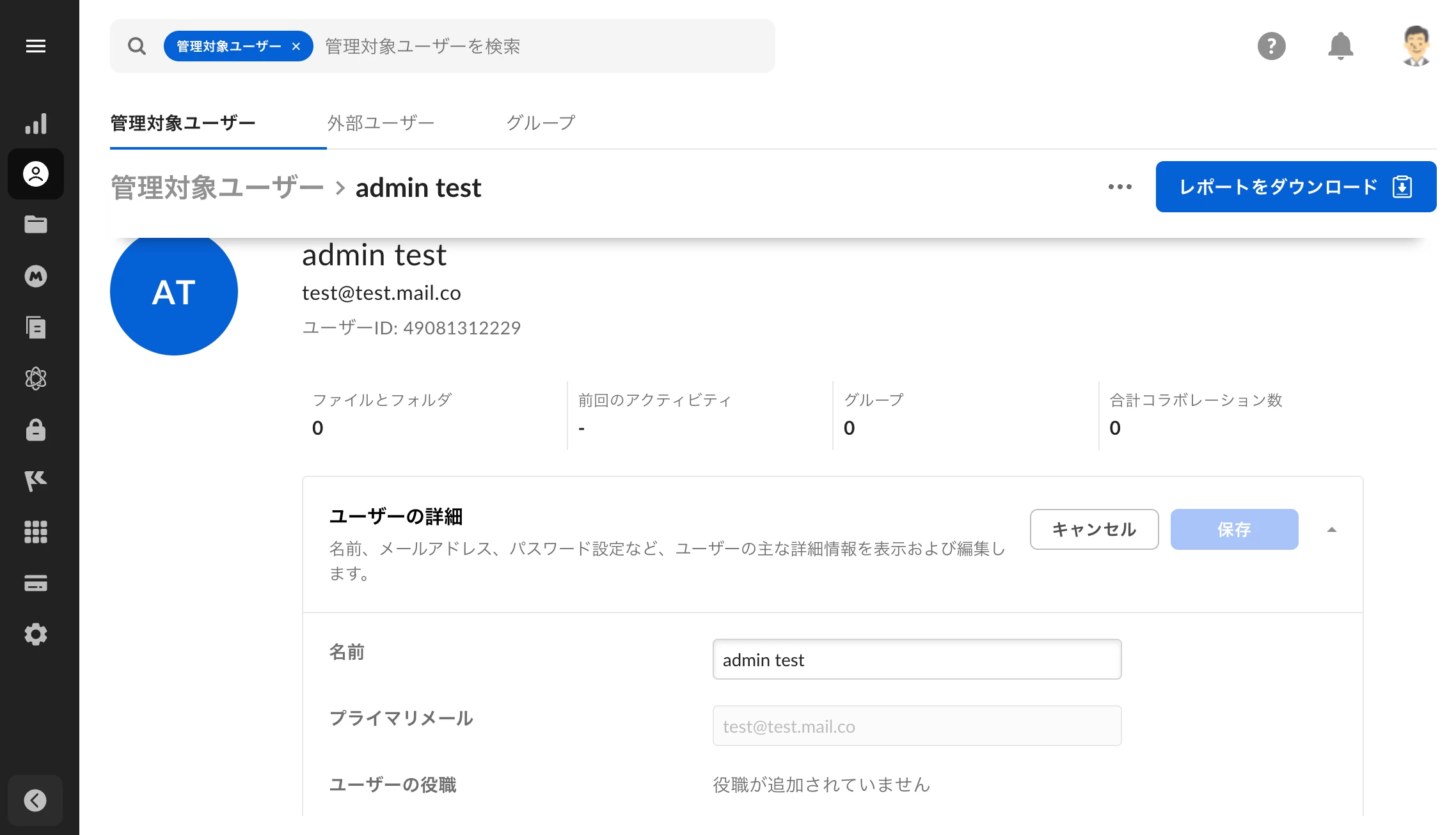 Box管理コンソールからプロビジョニング済みユーザーのメールアドレスを変更しようとしています。しかし、添付のスクリーンショットにあるように、メールアドレスのテキストボックスが無効/グレー表示になっており、何も入力できません。