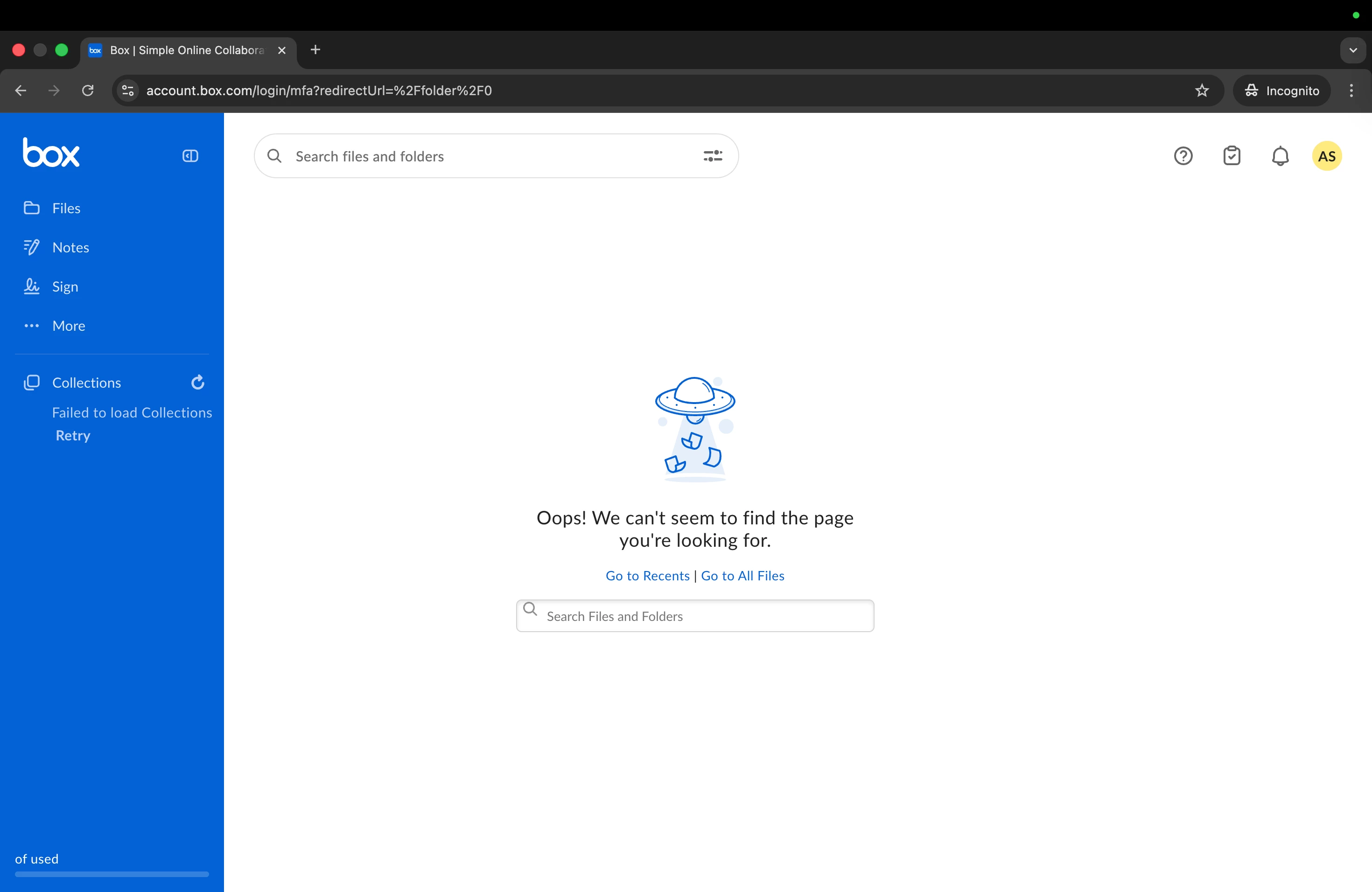 They’ve lost access to their Box folders and are receiving the error: “Oops! We can't seem to find the page you're looking for.” Previously, access was working normally, but now they’re unable to see any collaboration folders.