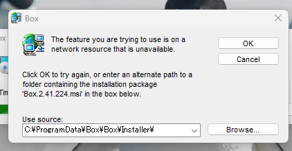 However, when I attempt to install the new version, the installer still recognizes that Box was previously installed—although I’m not sure where the information is stored—and it prompts me for the old installer file “Box.2.41.224.msi.”