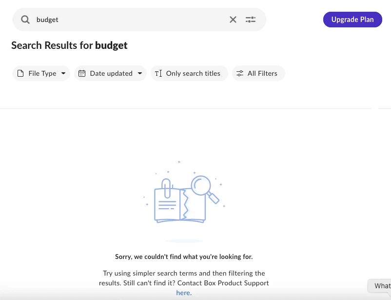 I clearly have a file in my Box account with the word “budget” in the title. When I type “budget” in the search bar, nothing shows up. I’ve tried other search terms that should work and they don’t.