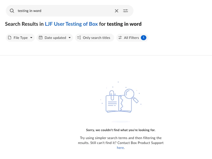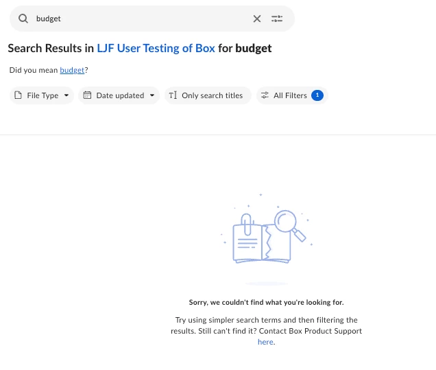 I clearly have a file in my Box account with the word “budget” in the title. When I type “budget” in the search bar, nothing shows up. I’ve tried other search terms that should work and they don’t.