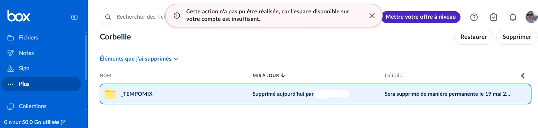However, my account has a 50GB storage limit. When I try to restore the folder, Box prevents the action, stating that the folder exceeds my account's capacity.