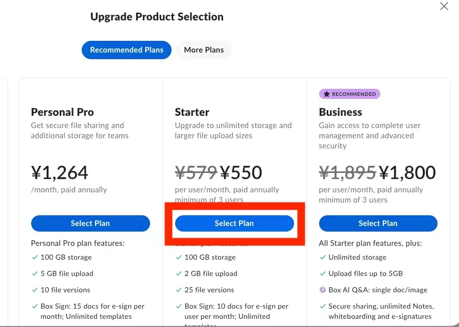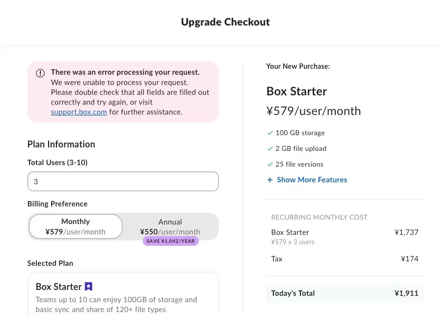 I am currently using a Box Individual account and would like to upgrade to the Starter Plan. However, when I try to complete the upgrade, I receive the following error message:
