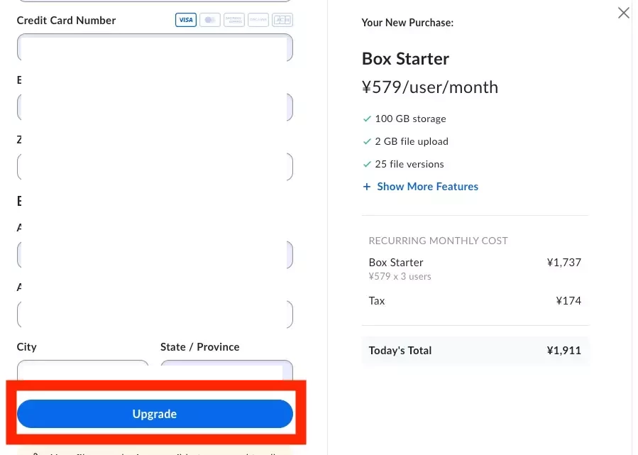 We were unable to process your payment information. Please double check that all fields are filled out correctly and try again, or visit support.box.com for further assistance.