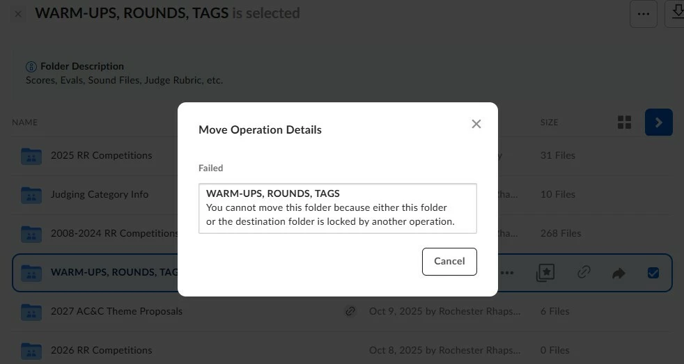 Receiving message “You cannot move this folder because either this folder or the destination folder is locked by another operation.” We have had this Box account for many years and have never received this message when moving folders - until a few days ago. I cannot copy the folder either - Similiar message received. There is no visible lock on either the source or destination folders.